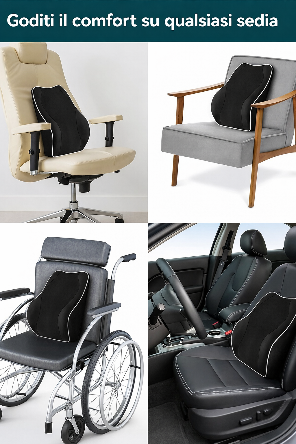 Posiziona il cuscino sulla tua sedia preferita, che sia in auto, in ufficio o sulla poltrona da lettura. Grazie al design ergonomico, il cuscino si adatta perfettamente alla curvatura naturale della tua schiena, offrendo un supporto ottimale alla zona lombare.